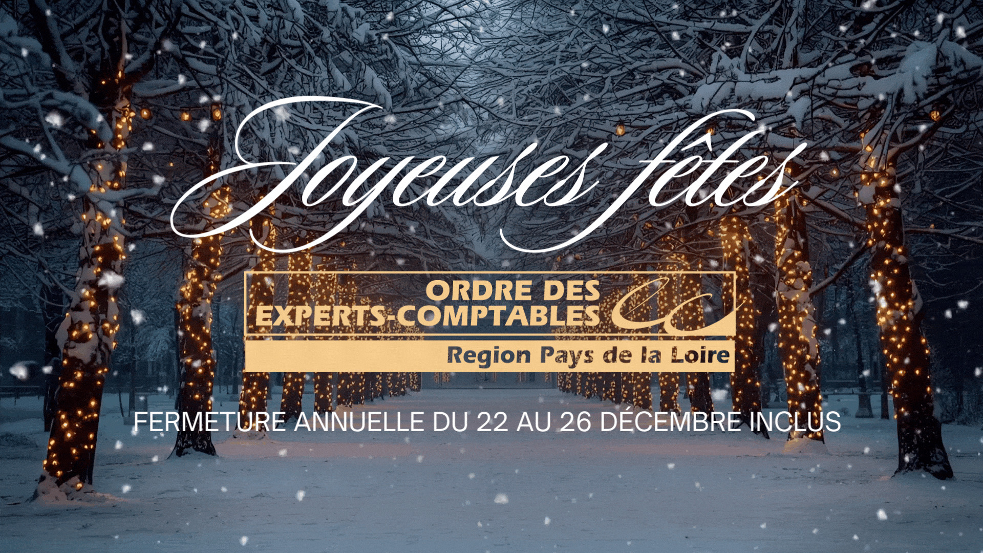 Publié le 18/12/2025 Actualités Fermeture annuelle – du 22 au 26 décembre inclus AccueilActualitésFermeture annuelle – du 22 au 26 décembre inclus Fermeture des bureaux pour les vacances de Noël du lundi 22 décembre au vendredi 26 décembre inclus. Toute l’équipe de l’Ordre des Experts-Comptables des Pays de la Loire vous souhaite de Joyeuses Fêtes.