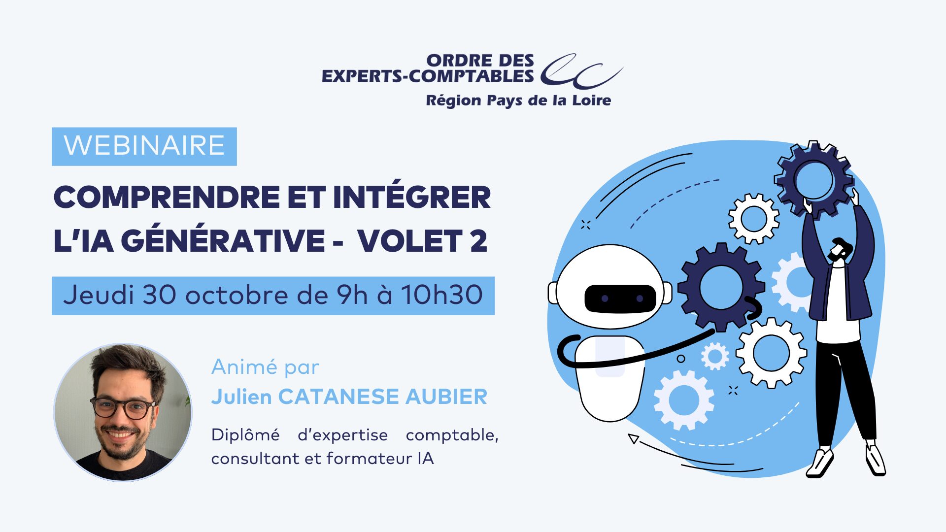 Publié le 30/10/2025 Actualités REPLAY – Webinaire « Comprendre et intégrer l’IA générative – Volet 2 » AccueilActualitésREPLAY – Webinaire « Comprendre et intégrer l’IA générative – Volet 2 » REPLAY – WEBINAIRE Comprendre et intégrer l’intelligence artificielle générative – Volet 2 Après une introduction par la Commission Numérique de l’Ordre des Experts-Comptables des Pays de la Loire, Julien CATANESE AUBIER, Diplômé d’expertise comptable, consultant et formateur IA est intervenu lors de ce webinaire. Retrouvez les documents partagés lors de ce webinaire : Brochure IA 2025 SIC 452 octobre 2025